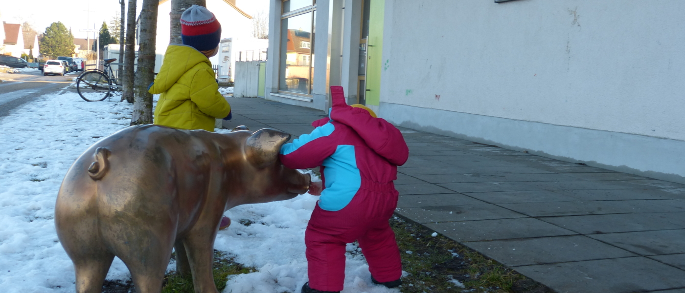 Wir sind die mit dem goldenen Schwein! Die Kinderkrippe in der Gleissnerstraße 16 befindet sich in einem freistehenden, modernen Haus, inmitten eines ruhigen Wohngebietes in Ramersdorf. Vor unserem Haus hat die Künstlerin Tina Haase die Skulptur eines goldenen Schweinchens platziert, welches als Erkennungsmerkmal vor dem Krippeneingang unsere Kinder allmorgendlich begrüßt und sie zum darauf herumkraxeln einlädt. Unser Garten bietet, neben Spielgeräten und Sandkasten, unterschiedliche Obstbäume und -sträucher, Kräuter- und Gemüsebeete. Hier kann das ganze Jahr über gegraben, gewerkelt und geerntet werden. Auch den Kompost beziehen wir in unsere pädagogische Arbeit mit ein: die Kinder untersuchen, welche nützlichen Insekten sich unter den Gartenabfällen verbergen. In den hellen und kindgerecht gestalteten Räumen werden je 12 Kinder in 3 Gruppen betreut. Für Ausflüge in die Natur außerhalb unseres Gartens, bieten sich der Ostpark sowie unterschiedliche Spielplätze in fußläufiger Entfernung an.